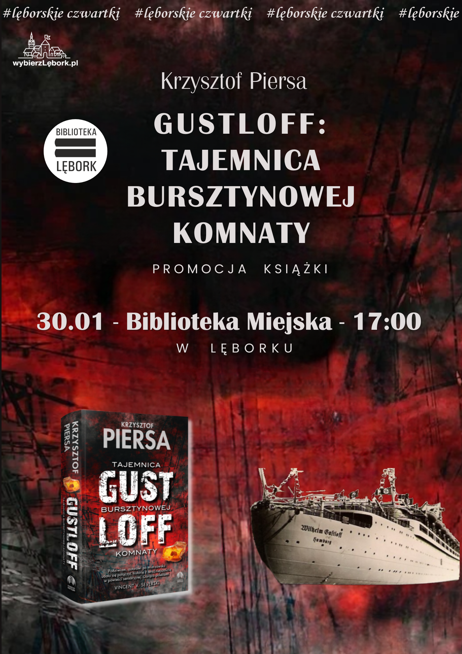 Z tej okazji w ramach #lęborskieczwartki 30 stycznia o godz. 17 w klubie biblioteki odbyło się spotkanie z Krzysztofem Piersą – autorem książki „Gustloff: Tajemnica Bursztynowej Komnaty”, który próbował odpowiedzieć nam na pytanie czy na statku była bursztynowa komnata. Na spotkaniu była możliwość zakupu książki wraz z autografem.