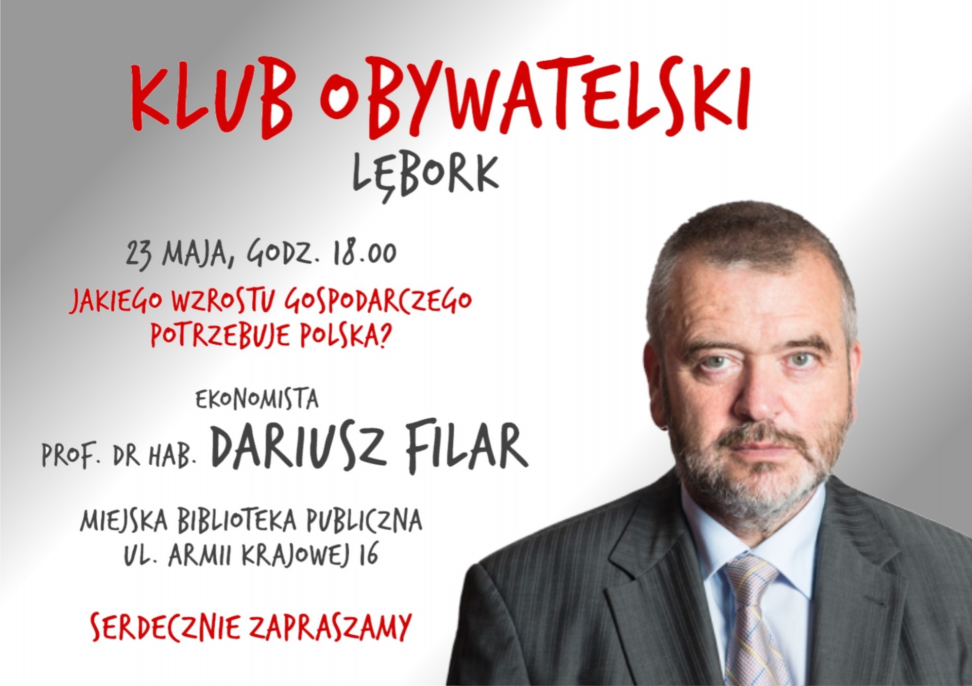 23 maja o godz. 18 w klubie lęborskiej biblioteki odbędzie się spotkanie na temat jakiego wzrostu gospodarczego potrzebuje Polska. Gościem wieczoru będzie prof. dr hab. Dariusz Filar – ekonomista, specjalista zakresie makroekonomii i zarządzania międzynarodowego, pracownik Uniwersytetu Gdańskiego.