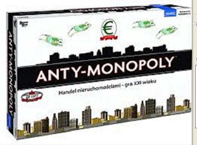 ANTY-MONOPOLY to gra polegająca na handlu nieruchomościami. Daje graczom możliwość obracania wielkimi pieniędzmi i wzbogacenia się. Sukces w grze zależy od trafnych inwestycji i mądrze prowadzonych transakcji. Gracze dzielą się na Przedsiębiorców i Monopolistów. Wygrywa gracz, który zostanie najbogatszym Przedsiębiorcą, gdy zbankrutują wszyscy Monopoliści, albo zostanie najbogatszym Monopolistą, gdy zbankrutują wszyscy Przedsiębiorcy.
