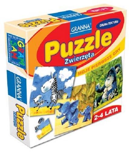 Twoje pierwsze puzzle. Na pewno mama pomoże ci je ułożyć. Zobaczysz jakie to proste. Tu jest kawałek, na którym słonik trzyma trąbą swoją mamę za ogon, a na tym kawałku mama uśmiecha się do słonika. I już obrazek jest ułożony. A teraz spróbuj ułożyć brykające zebry. Elementy wykonane są z grubej i twardej tektury. Gra może być zabawką także dla jednego dziecka.