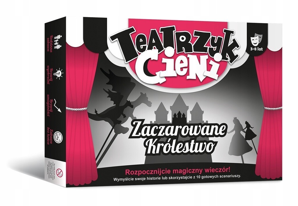 Weźcie do rąk postacie z Zaczarowanego Królestwa i rozpocznijcie przedstawienie! Wymyślcie wspólnie historie do odegrania lub skorzystajcie z 10 scenariuszy w załączonej książeczce. Teatrzyk Cieni to niezwykły pomysł na spędzenie magicznego wieczoru wspólnie z Twoim dzieckiem!Teatrzyk Cieni to zestaw wyjątkowych postaci, które ożyją jako cienie na ścianie pokoju Twojego dziecka.