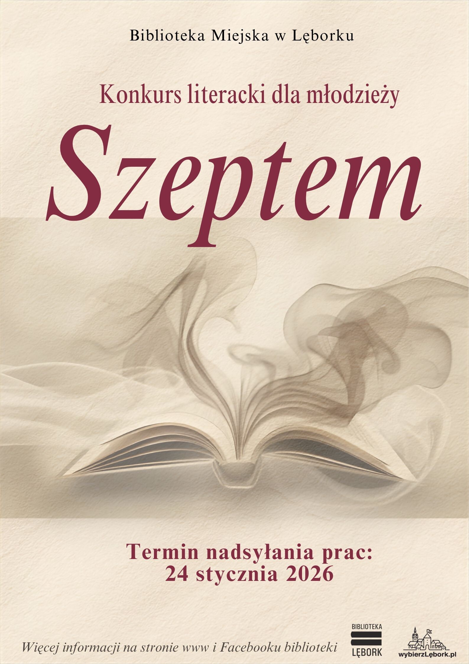 Miejska Biblioteka Publiczna w Lęborku ogłasza konkurs literacki „Szeptem” dla młodzieży ze szkół podstawowych (kl. VII – VIII) i szkół średnich z powiatu lęborskiego. Konkurs obejmuje utwory poetyckie i prozatorskie o dowolnej tematyce, które należy przynieść lub przysłać do lęborskiej biblioteki do 24 stycznia 2026 roku.